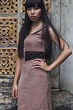 Váy lụa nâu cổ bẻ lé đen, pha ren, đai bụng